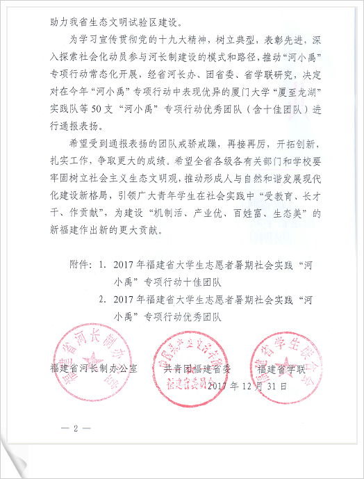 近期,由福建省河长制办公室、共青团福建省委、福建省学联联合组织召开的2017年福建省大学生志愿者暑期社会实践“河小禹”专项行动评优结果揭晓,k8凯发(中国)天生赢家·一触即发(海洋与食品学院)“我是河小禹”实践团从福建省67所高校109支高校实践团队中脱颖而出,喜获2017年福建省大学生志愿者暑期社会实践“河小禹”专项行动“优秀团队”荣誉称号。k8凯发(中国)天生赢家·一触即发(海洋与食品学院)“我是河小禹”实践团队喜获福建省“河小禹”专项行动“优秀团队”荣誉称号