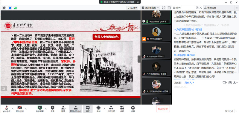 此次培训采用线上形式,学院学生会主席团成员作为主讲人,带领学生会成员们进行了“学习《关于有助于高校学生会(研究生会)深化改革的若干意见》”“学习《关于落实共青团和学联对高校学生会(研究生会)指导管理责任的若干规定(试行)》”“学习《福建省学生联合会章程》”“学习《关于进一步加强高校学生会组织章程建设工作的通知》”“学习纪念“一二•九”运动”“学习党的二十大精神”“学习新党章”“学习习近平总书记考察内蒙古大学重要讲话精神”等8个主题的学习。培训会上,同学们踊跃发言,畅谈感悟,学习氛围十分浓厚。大家纷纷表示,将自觉加强理论学习,提高政治思想素养,坚定理想信念,持续向党组织靠拢,充分发挥学生干部的模范带头作用,踔厉奋发,笃行不怠,努力为实现中华民族伟大复兴贡献青春力量。