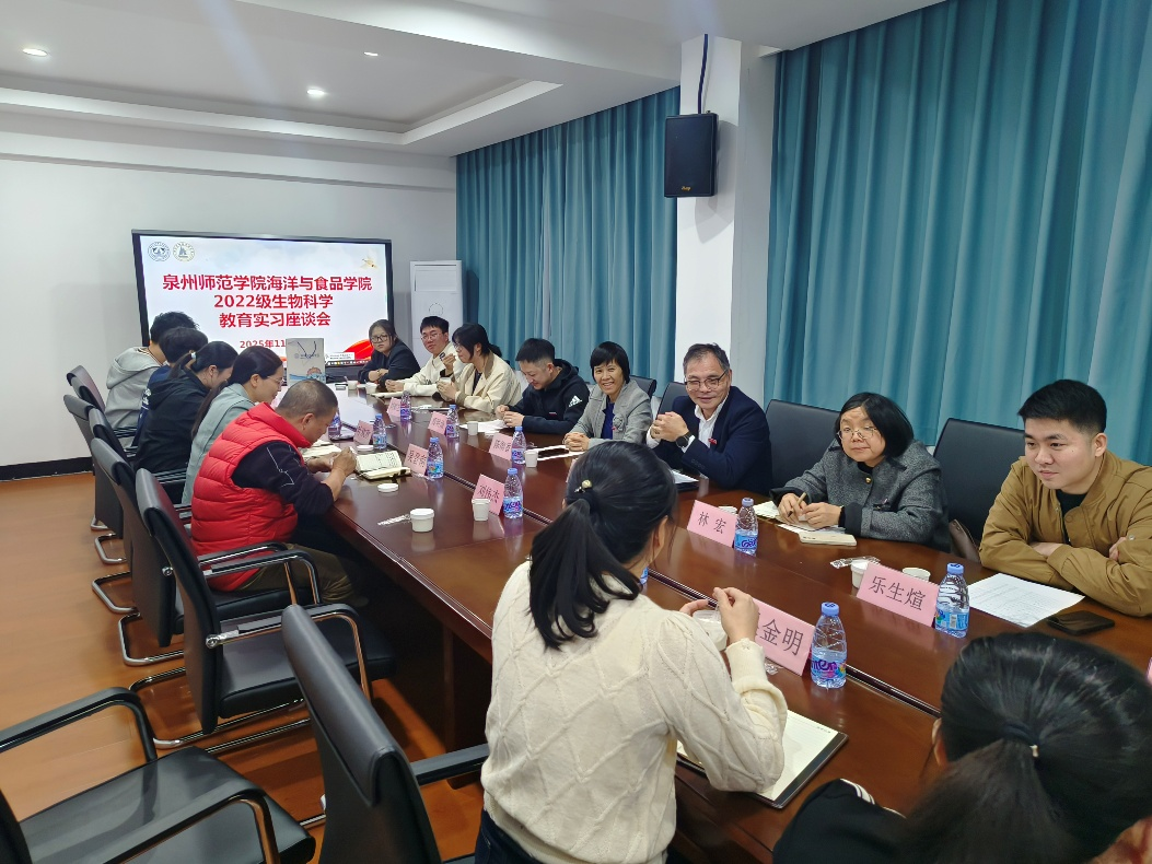 为进一步分析生物科学专业教育实习生在岗实践情况,传递学院关怀并加强实践指导,深化高校与中学之间的协同育人机制,日前,学院党委书记蔡志荣、生物科学系主任陈细香、教学科研办副主任林宏、带队老师周明灿及辅导员乐生煊一行5人,前往泉州明新华桥中学走访慰问2022级生物科学专业教育实习生。校长刘伟杰、副校长吴晋南、教务处主任吴金明、办公室主任曾硕萍、指导老师陈燕红、傅青山等领导老师参加座谈。